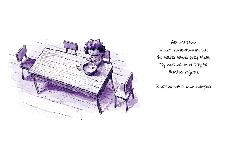 Violet tęskni za czasami, kiedy cała rodzina spotykała się przy wspólnym stole. Jedli, rozmawiali, żartowali i cieszyli się swoim towarzystwem. Teraz każdy pędzi do swoich zajęć, rozrywek, telefonów i komputerów. A ich stół, nikomu już niepotrzebny, staje się coraz mniejszy i mniejszy, aż w końcu znika… Czy dziewczynce uda się go odbudować dzięki ponownemu zgromadzeniu rodziny?