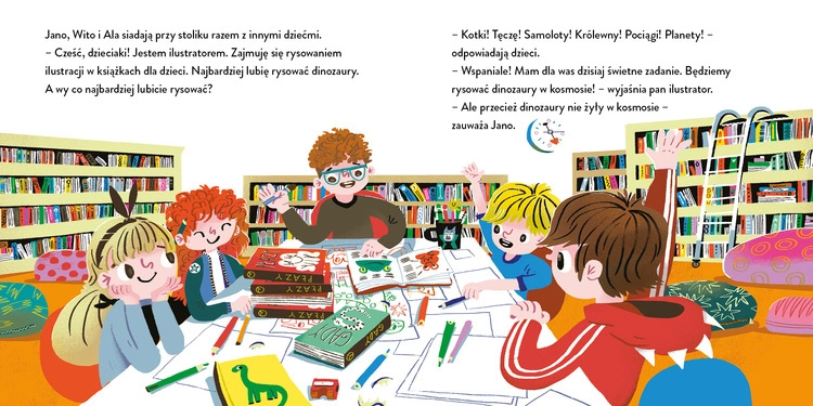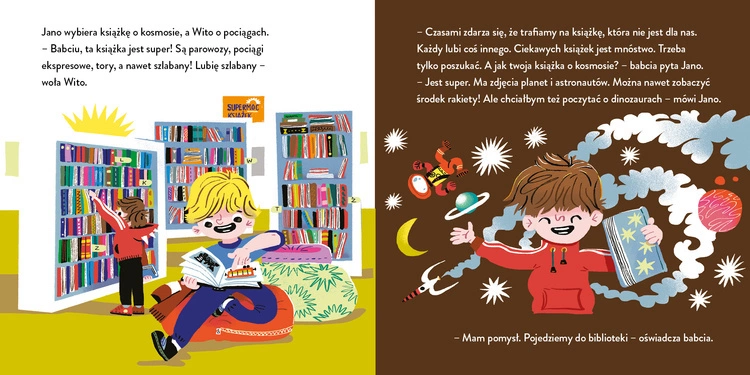 Jano i Wito poznają świat książek: odwiedzają księgarnię, bibliotekę, poznają pracujące tam osoby i bogactwo literatury. W bibliotece biorą udział w warsztatach z ilustratorem, podczas których doskonale się bawią rozwijając swoją wyobraźnię i kreatywność.
