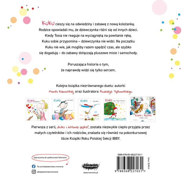 "Kuku" to bestsellerowa seria książek dla dzieci w wieku 3-5 lat. To opowieść o rodzinie tytułowego małego chłopca, który uczy się o miłości, tęsknocie, szczęściu. W kolejnych tomach serii dzieci mogą towarzyszyć Kuku w codziennych sytuacjach, poznając przy tym ważne aspekty życia. Seria książek „Kuku” to idealna propozycja na pierwsze lektury, które wprowadzają najmłodszych w świat pełen wartości i mądrości. Poznaj całą serię tutaj.