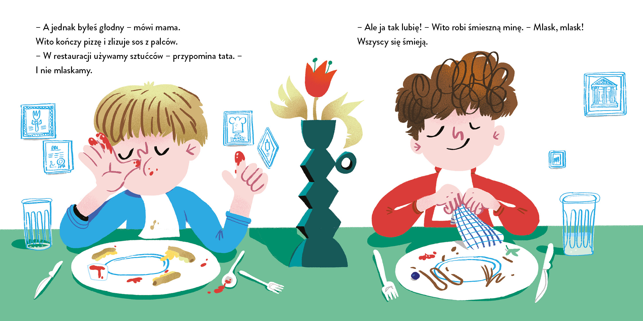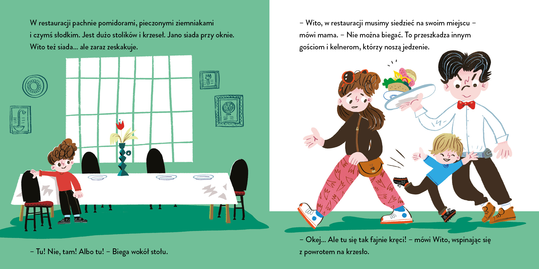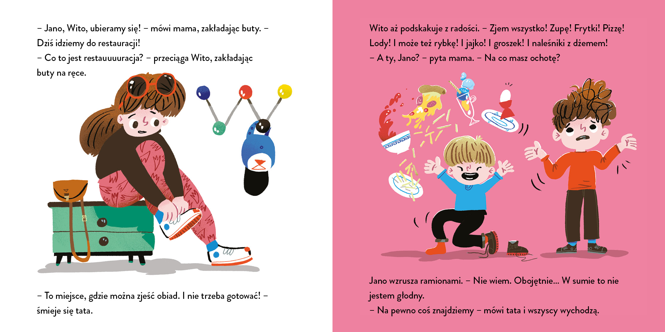 Jano i Wito jeszcze nigdy nie byli w restauracji! Teraz wszyscy wybierają się na rodzinny obiad. Chłopcy jeszcze nie zdecydowali, co będą jedli, i nie do końca wiedzą, jak mają się zachowywać. Od czego jednak pomoc rodziców i obsługi!
