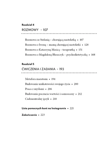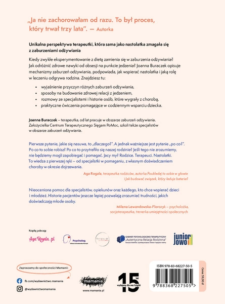 W książce znajdziesz rozmowy ze specjalistami, prawdziwe historie pacjentek i ich rodzin, a także unikalne spojrzenie autorki, która sama w wieku nastoletnim zmagała się z anoreksją.