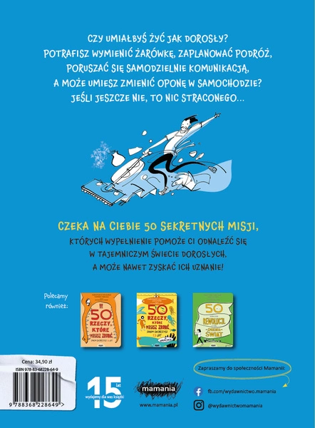 Czy umiałbyś żyć jak dorosły? Potrafisz wymienić żarówkę, zaplanować podróż, poruszać się samodzielnie komunikacją, a może umiesz zmienić oponę w samochodzie? Jeśli jeszcze nie, to nic straconego – czeka na ciebie 50 sekretnych misji, których wypełnienie pomoże ci odnaleźć się w tajemniczym świecie dorosłych, a może nawet zyskać ich uznanie!