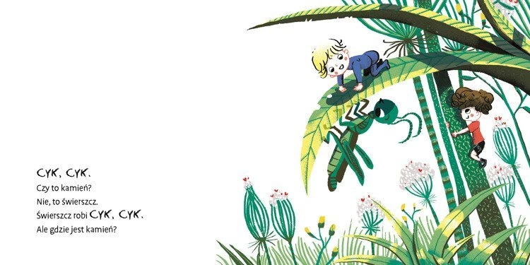 Duży Jano i mały Wito znajdują tajemniczy kamień. Co się stanie, kiedy go dotkną? Ojej, to magiczny kamień! Teraz wszystko zrobiło się taaakie duuuże – wąż jest ogromny, wielka pszczoła robi bzzz, bzzz i można się nawet wspinać na zająca!